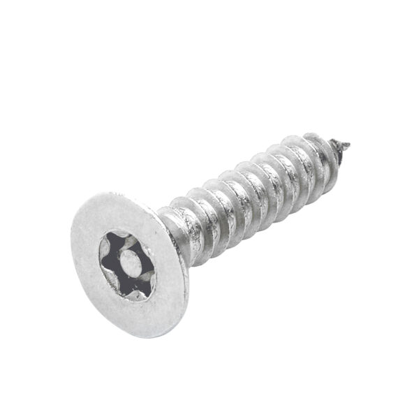 Säkerhetsskruv, gängpressande, med försänkt skalle och torxgrepp med pinne, rostfri A2. Skruven är en tvåvägsskruv men med relativt låg säkerhet då bitset är vanligt förekommande.