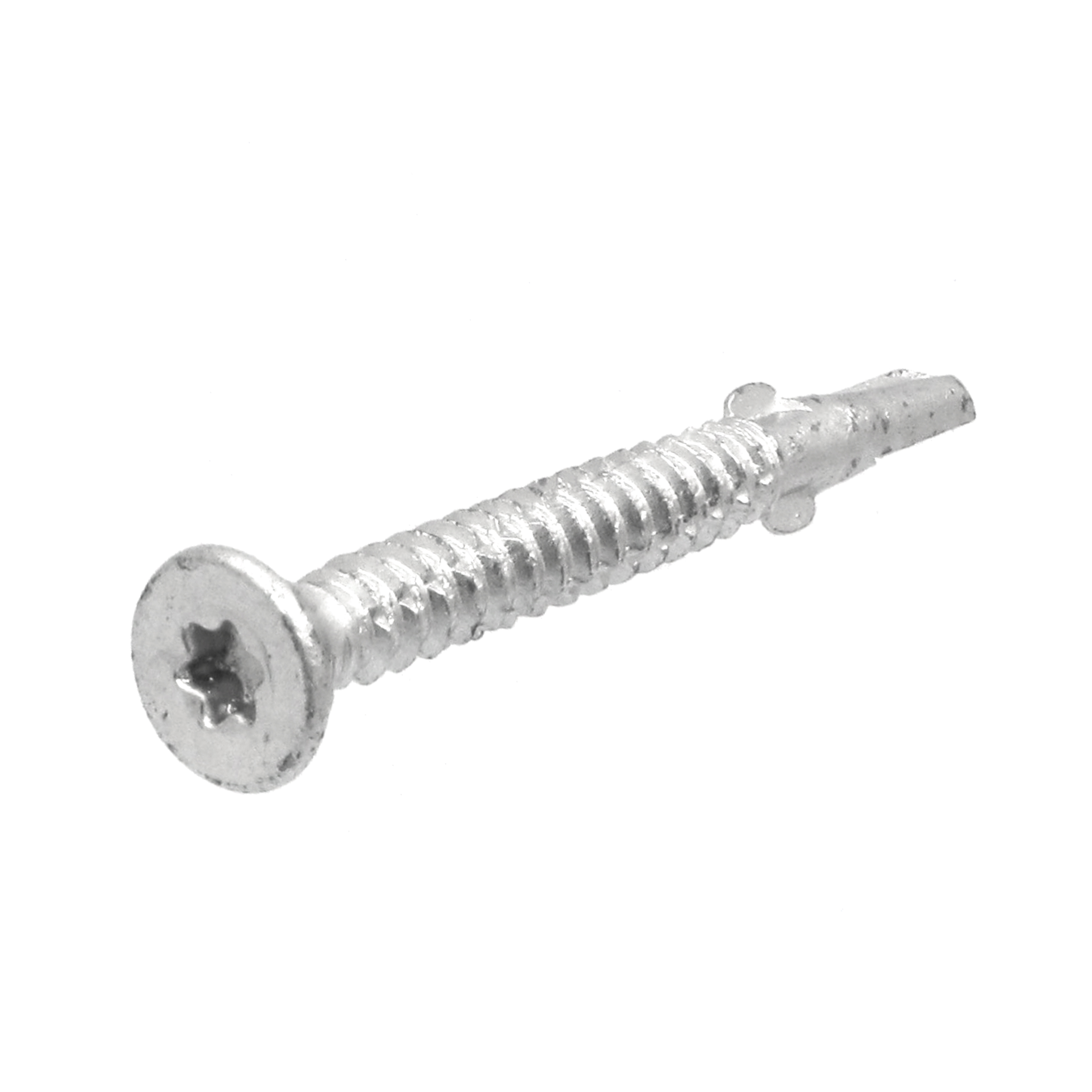 Borrande och gängpressande skruv för trä mot plåt. Vingar som fräser upp hålet i trät. När borrspetsen går igenom stålet bryts vingarna av. Försänkt skalle med rillor och torxgrepp, zinkflakes behandlad.